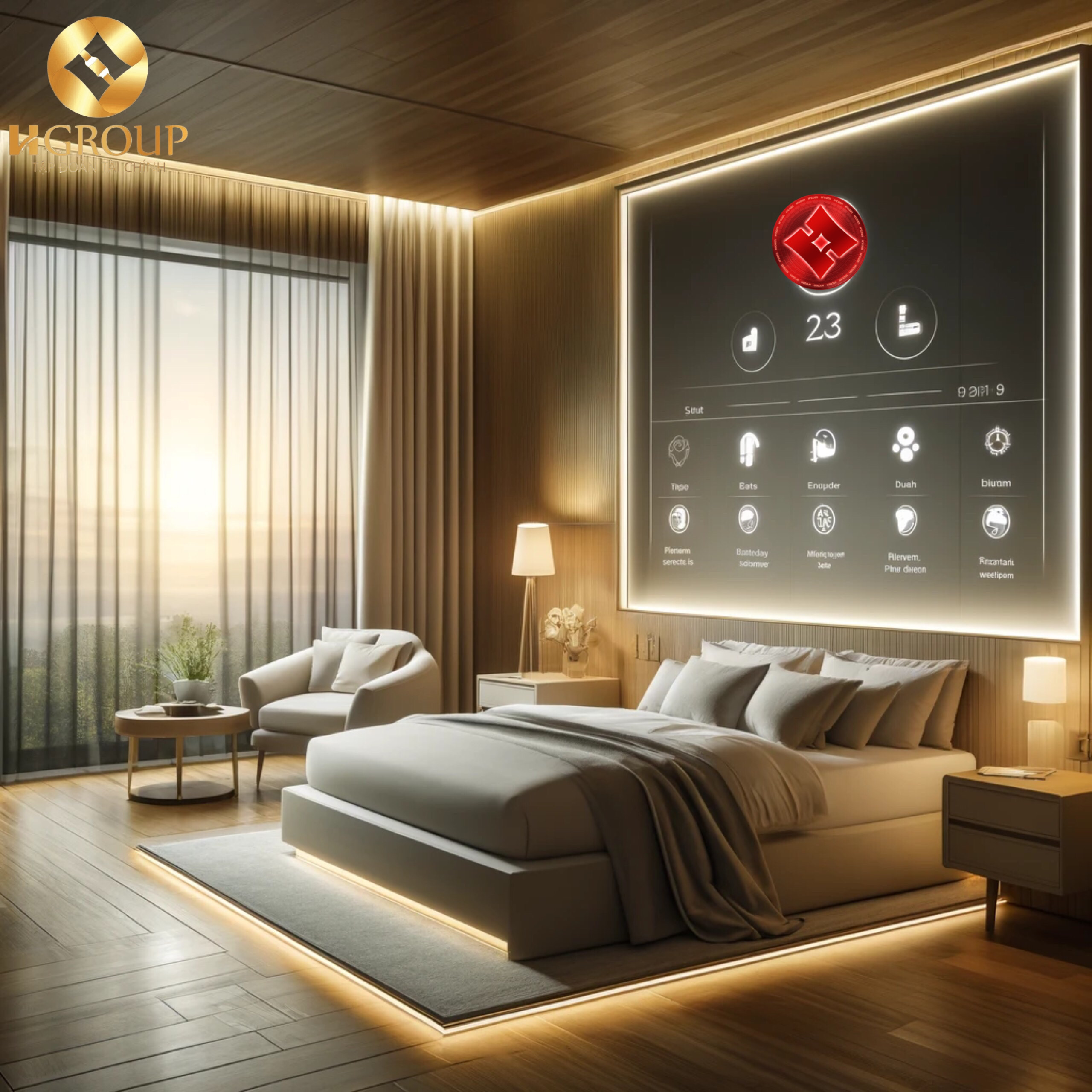 Phòng ngủ chính: Một không gian yên tĩnh, thư giãn với hệ thống chiếu sáng tự động điều chỉnh theo mức độ ánh sáng tự nhiên, rèm cửa tự động, và giường thông minh có thể theo dõi giấc ngủ và điều chỉnh độ cứng của nệm để đảm bảo giấc ngủ tốt nhất.
