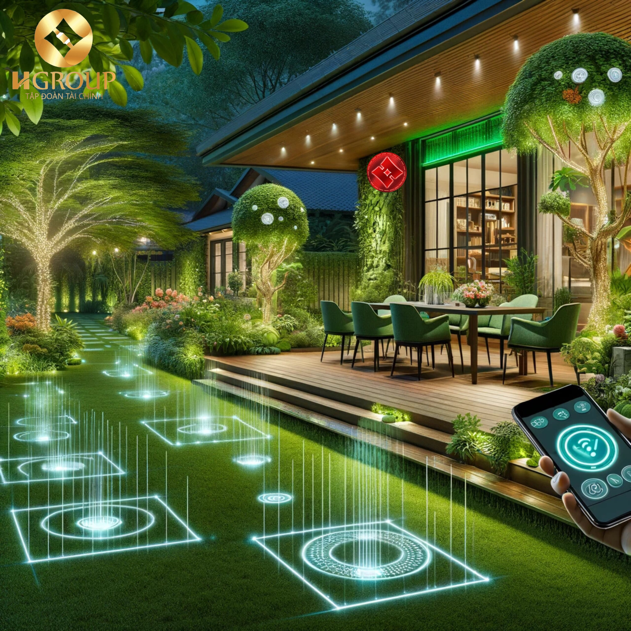 Sân vườn: Một không gian ngoại thất xanh mát với hệ thống tưới tự động thông minh, ánh sáng sân vườn tự điều chỉnh theo môi trường xung quanh và khu vực tiệc ngoài trời có thể được điều khiển từ xa.
